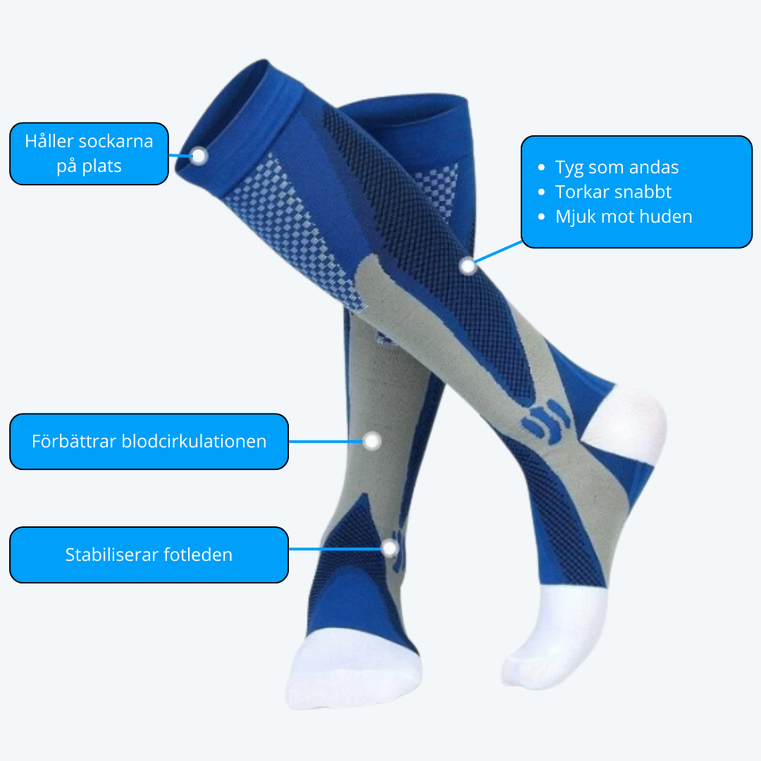 De lindrar trötthet och smärta i benen, minskar svullnad, samt håller dom bekväma och torra.
